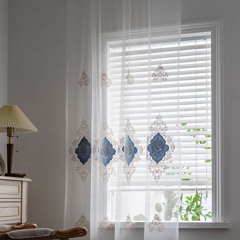 Ogni dettaglio di questa tenda è stato pensato per incantare. I motivi barocchi, finemente ricamati in un delicato color oro e impreziositi da un magnifico blu, creano un contrasto visivo che cattura lo sguardo. Il tessuto velato permette alla luce naturale di illuminare l'ambiente senza rinunciare alla privacy, creando un'atmosfera calda e accogliente. È la soluzione ideale per chi desidera un ambiente sofisticato e pieno di carattere, un vero gioiello per ogni finestra.